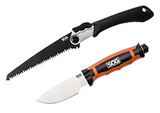 Light up your way in and saw your way out! What a combo deal this is. The bladelight Hunting knife has six white LED lights in the handle that can be turned on with just one push of a button. The handle is an orange color-to help you see it- and the handle has a water resistant housing around it. The satin finished blade is a 3.8 folding style knife that has a kydex sheath. The blade steel is 8Cr13MoV and the overall knife is 8.5 long. The folding saw is made of a tempered high carbon steel that is 8.25 long and weighs 5.9 oz. The handle is made of kraton rubber which gives it a soft grip for better comfort and control and comes with a nylon sheath. This saw can cut down brush, small logs, branches and bushes. Two great favorites in one package. |